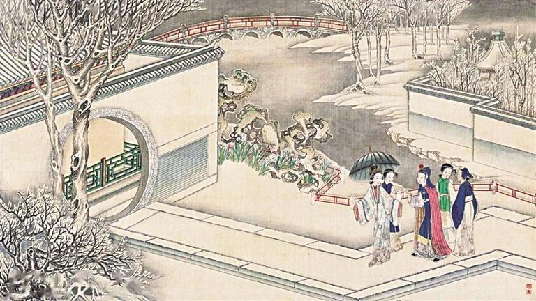 著名紅學(xué)家周汝昌曾評論清代孫溫《紅樓夢》繪本是“紅樓瑰寶”,其中一處細(xì)節(jié)就配得上這種評論。賈政攜寶玉和眾客游覽大觀園的繪制中,孫溫用了13幅畫并以焦點游移的手法,一路將賈政等人的路線詳細(xì)描繪出來,跟著畫面而走,觀者可以看到瀟湘館、蘅蕪院、沁芳亭、沁芳橋等大觀園景觀,令人嘆為觀止。