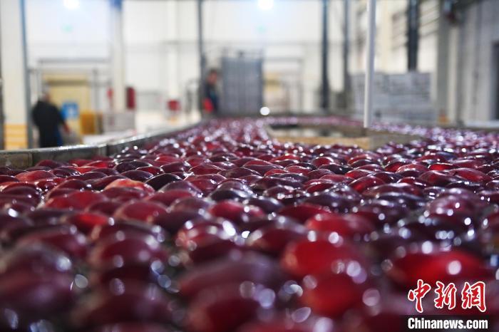 10月21日,在甘肅省天水市秦安縣雪原果品有限公司加工車間,蘋果自動化分揀線上工作人員進行分揀工作。該生產(chǎn)線每天能處理30噸蘋果,蘋果經(jīng)過設(shè)備水洗、烘干、稱重等環(huán)節(jié),進入不同等次的包裝線,工人們再對每顆蘋果進行復(fù)檢、貼標(biāo),分裝在不同規(guī)格的包裝箱中。甘肅秦安蘋果總面積61.37萬畝,產(chǎn)量86.8萬噸,產(chǎn)值55.6億元人民幣,先后從國內(nèi)科研院所引進青砧、M26、ZH5等抗重茬蘋果矮化砧木6個,配合國家蘋果產(chǎn)業(yè)技術(shù)體系,引進長富2號、煙富6號、煙富8號、瑞香紅等蘋果新品種12個。中新社記者李亞龍攝