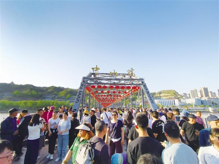 蘭州以火樣熱情和西北風(fēng)情吸引天南海北游客紛至沓來,人們在煙火氣和文化味之間尋找到這座城市的獨(dú)特魅力。圖為中山橋前游人如織。