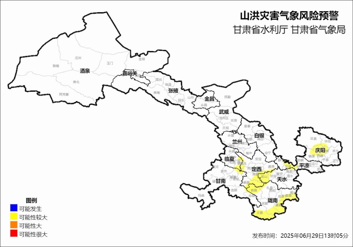 根據(jù)省氣象局《重大氣象信息專報(bào)》(2025年甘氣第10期),未來(lái)十天甘肅省多降水天氣,具有對(duì)流性強(qiáng)、小時(shí)雨強(qiáng)大、累積雨量大等特點(diǎn),洪水災(zāi)害風(fēng)險(xiǎn)高。6月29日13時(shí),省水利廳、省氣象局聯(lián)合發(fā)布山洪災(zāi)害氣象風(fēng)險(xiǎn)預(yù)警:預(yù)計(jì),6月29日14時(shí)至30日14時(shí),白銀市(景泰縣),武威市(古浪縣),定西市(臨洮縣、渭源縣、通渭縣、隴西縣、漳縣、岷縣),臨夏州(廣河縣、東鄉(xiāng)縣、康樂縣),甘南州(臨潭縣、卓尼縣、舟曲縣、迭部縣),天水市(秦安縣、甘谷縣、武山縣、張家川縣),隴南市(宕縣、禮縣、武都區(qū)、成縣、文縣、康縣、徽縣、兩當(dāng)縣),平?jīng)鍪校o寧縣、崆峒區(qū)、華亭市、莊浪縣),慶陽(yáng)市(西峰區(qū)、慶城縣、環(huán)縣、華池縣、鎮(zhèn)原縣)等地區(qū)發(fā)生山洪災(zāi)害可能性較大(黃色預(yù)警)。