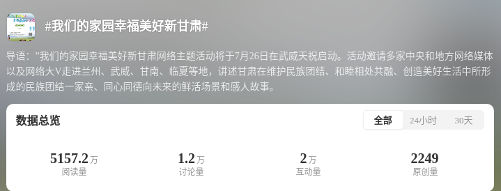 為深化互動(dòng)引導(dǎo),打造高流量IP,@甘肅網(wǎng)信、@快看甘肅等官方賬號(hào)發(fā)起社交平臺(tái)互動(dòng)話題#我們的家園幸福美好新甘肅#。結(jié)合#厚道甘肅##萬千氣象看甘肅#等話題,@中新觀隴、@中國(guó)甘肅網(wǎng)、@甘肅好網(wǎng)民、@蘭州新區(qū)發(fā)布、@甘南融媒等賬號(hào)同步發(fā)力、同頻共振。目前,該話題總閱讀量超5530萬人次,討論互動(dòng)量3.2萬人次。