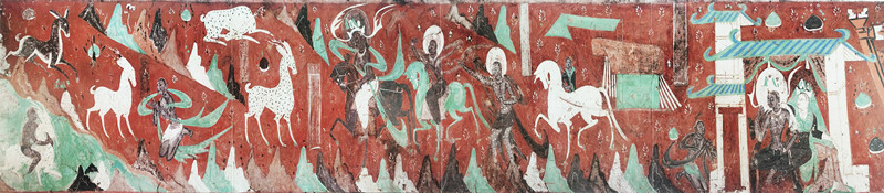 這幅壁畫在藝術風格上獨樹一幟,深受中原繪畫形式的影響。它既摒棄了印度壁畫的環(huán)形構圖方式,又不同于龜茲壁畫里的菱形畫面布局,而是開創(chuàng)性地采用了連環(huán)畫式的長卷式構圖,宛如一條歷史的長河,將故事娓娓道來。
