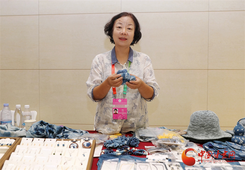 在第八屆進(jìn)博會的現(xiàn)場,甘肅館以其獨特的人文底蘊吸引了眾多目光。展館內(nèi),弧形山脈造型的背景,仿佛展現(xiàn)著甘肅的壯美風(fēng)光,而慶陽香包、敦煌絲巾等精美展品,則如璀璨明珠,訴說著甘肅的文化魅力。就在這其中,來自平?jīng)龅墓欧ㄋ{(lán)染技藝展臺格外引人注目,一件件藍(lán)染作品散發(fā)著獨特的草本氣息,向世界展示著非遺的獨特魅力,而這些作品的創(chuàng)作者,正是平?jīng)鏊{(lán)染技藝的市級非遺傳承人李梅。