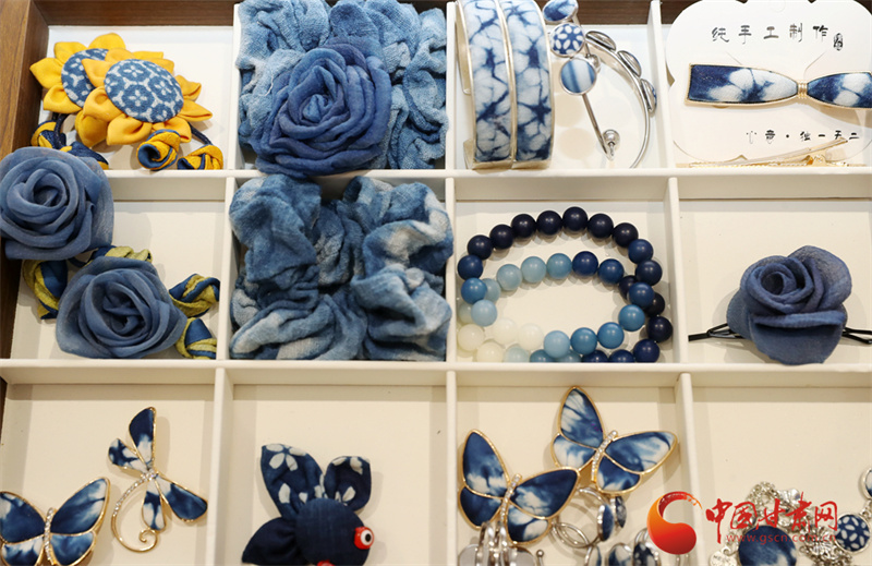 染好的布匹還要經(jīng)過脫漿、清洗、陰干,最后才是拆線、整理。當(dāng)一塊完整的藍(lán)印花布展現(xiàn)在眼前時,李梅總會輕輕撫摸布料,仿佛在與草木對話。她的工作室里,掛滿了用藍(lán)染制成的物件:桌布上印著成片的板藍(lán)根葉,茶席邊緣綴著小巧的藍(lán)染布扣,就連她日常穿的棉麻衫,也是自己染的淡藍(lán)色。“這些布不是冰冷的商品,是帶著土地溫度的生活。”李梅說,去年她在平?jīng)龉懦情_了一間“藍(lán)染生活館”,游客可以跟著她學(xué)種板藍(lán)根、體驗扎染,很多人第一次發(fā)現(xiàn),原來衣服上的藍(lán)色可以來自田野,非遺技藝能如此貼近日常。