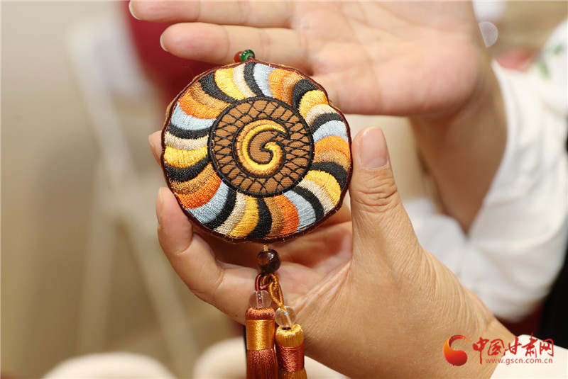 甘肅省博物館非遺集市的展臺(tái)前,包雨蕾的敦煌藻井香包一亮相就攥住了人的目光——青綠色絲線繞出的蓮瓣層層疊疊,中心飛天剪影隨腳步輕晃,清雅檀香混著花草香漫開來。這款光是飛天飄帶針法就琢磨了一個(gè)月的新作,藏著她的心思:用慶陽香包的針腳,把甘肅的千年文脈繡進(jìn)當(dāng)下生活。