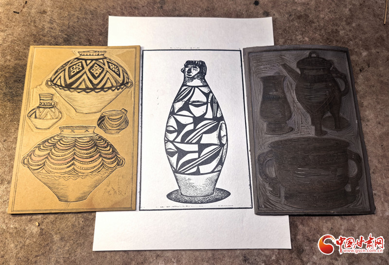 當(dāng)被問(wèn)及如何將非遺符號(hào)轉(zhuǎn)化為現(xiàn)代語(yǔ)言時(shí),趙寧再次以《甘肅彩陶系列版畫(huà)》為例。自2018年起,他便持續(xù)探索彩陶紋樣與現(xiàn)代版畫(huà)的融合之道。他不斷嘗試新的表現(xiàn)手法和創(chuàng)作思路,通過(guò)獨(dú)特的創(chuàng)意和精湛的技藝,讓古老器物在木刻紙上“重生”。在他的刀下,彩陶紋樣不再是簡(jiǎn)單的復(fù)制,而是被賦予了新的藝術(shù)生命,它們與現(xiàn)代版畫(huà)的元素相互交織、相互融合,形成了一種獨(dú)特而新穎的藝術(shù)風(fēng)格。