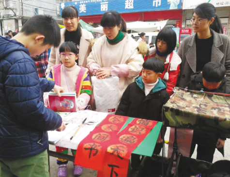 疫情之前,王子悅(左一)在集市上寫對(duì)聯(lián)送給借書的小朋友。