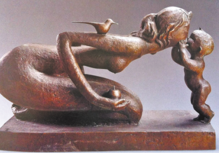 最后的廳,是一批中外馳名的雕塑代表作——從嬌小稚拙掌中把玩的小品到體量龐大高聳入云的巨構(gòu),無論隨形寫意、裝飾寫實(shí),美林都在策劃、構(gòu)成、調(diào)整、定型的繁復(fù)過程中,顯示出扎實(shí)的藝術(shù)功力與非凡的浪漫色彩。其中,龍、虎、馬、牛等動物系列,不僅延續(xù)了繪畫中獨(dú)有的造型風(fēng)格,而且更凝重渾厚,更富裝飾情趣。與眾不同人見人愛的母子系列中,不論是精心呵護(hù)襁褓嬰兒的母親,匍匐草地引領(lǐng)學(xué)步的母親,牽手寶寶步入校園的母親,造型、肢體的夸張之奇變形之巧,感官、神態(tài)的風(fēng)韻依依顧盼有情,讓人駐足良久再三流連……