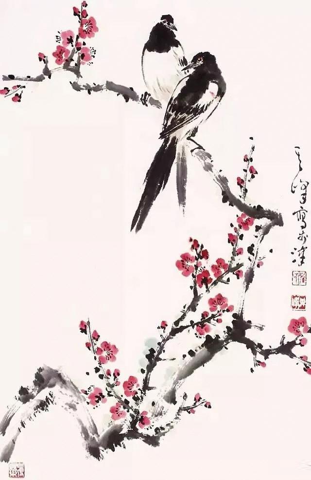 那是我第一次看見(jiàn)梅花,墨黑的枝干上,稀稀疏疏臥著幾朵紅紅的梅花,很安靜。畫(huà)上有四個(gè)字:傲雪紅梅。兩邊還有對(duì)聯(lián),內(nèi)容已經(jīng)不記得了。正值外面大雪紛飛,院子里已落了一層白白的積雪,一時(shí)間詩(shī)意悠然。對(duì)著那副梅花圖,清清爽爽的,令人內(nèi)心好快樂(lè)。那時(shí),我在讀《紅樓夢(mèng)》,只記住了那句:琉璃世界白雪紅梅。