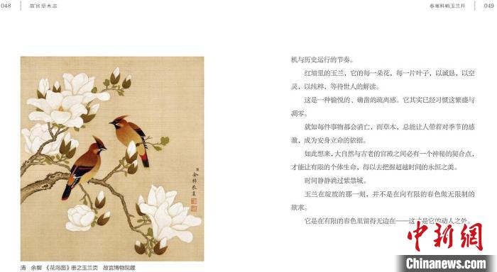 步入春天的紫禁城,文華殿書畫館前,海棠下既有扛著長槍短炮的攝影者,又有身著漢服仿佛穿越而來的妙齡女子,動靜之間,時空交錯,新的故事在生長……跟隨此書,在春日的芳菲中、在古老的書畫器用中,感受草木的繾綣,與生機(jī)勃勃的自然共赴一場故宮之約。