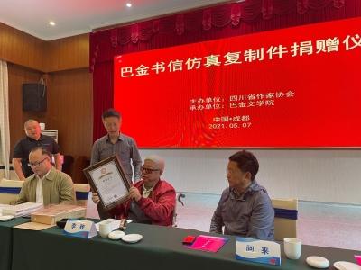 捐贈(zèng)儀式由四川省作協(xié)黨組書(shū)記侯志明主持,省作協(xié)主席阿來(lái)致辭。省作家協(xié)會(huì)向李致頒發(fā)了收藏證書(shū)。詩(shī)人黎陽(yáng)現(xiàn)場(chǎng)朗誦了巴金大哥寫(xiě)給巴金一封信的選段,內(nèi)容充滿(mǎn)情感,令人動(dòng)容。朱丹楓、廖全京等文藝界人士,以及巴金多位親屬出席了捐贈(zèng)儀式。