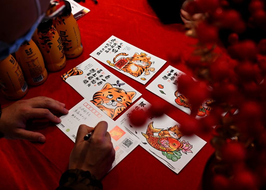 春節(jié)假期,作為文化節(jié)目《2022中國詩詞大會(huì)》的線下活動(dòng),詩詞市集在北京國貿(mào)商城舉行?;顒?dòng)邀請(qǐng)市民寫下一句詩,給2022年寄出一張?jiān)娫~明信片,帶動(dòng)詩歌熱潮,推動(dòng)詩詞文化走入百姓家。