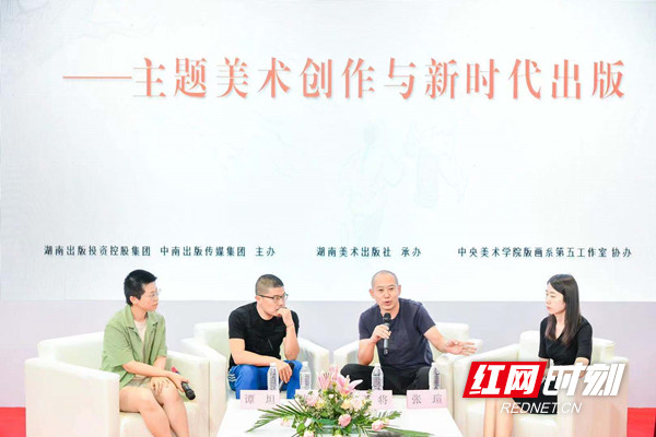 活動(dòng)現(xiàn)場(chǎng),康劍飛、武將、《少年毛澤東》項(xiàng)目藝術(shù)指導(dǎo)譚坦、《少年毛澤東》項(xiàng)目執(zhí)行張瑄等四位嘉賓,圍繞主題美術(shù)創(chuàng)作與主題出版、插圖與繪本演變、版畫的發(fā)展與傳播特點(diǎn)等議題展開討論,并結(jié)合湖南美術(shù)出版社即將出版的《少年毛澤東》,分享了創(chuàng)作心得,還與現(xiàn)場(chǎng)的讀者進(jìn)行了互動(dòng)交流。