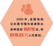 數(shù)據(jù)顯示,全國各級公共圖書館普遍開展講座、展覽、閱讀指導(dǎo)、讀書交流、演講誦讀等活動。僅2020年,各地公共圖書館就為讀者舉辦各種活動150713次,有9279.33萬人次參加。