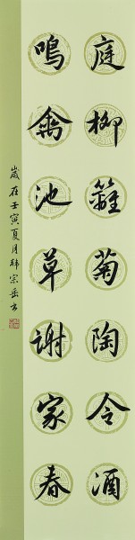 庭柳籬菊陶令酒,鳴禽池草謝家春。 釋文:庭前柳樹(shù),籬邊菊花,陶淵明飲酒于此,怡然自得;池塘里長(zhǎng)滿了春草,樹(shù)上的鳴鳥(niǎo)冬去春來(lái),謝靈運(yùn)因此寫(xiě)出了這樣的千載名句。韓宗岳(滿族)