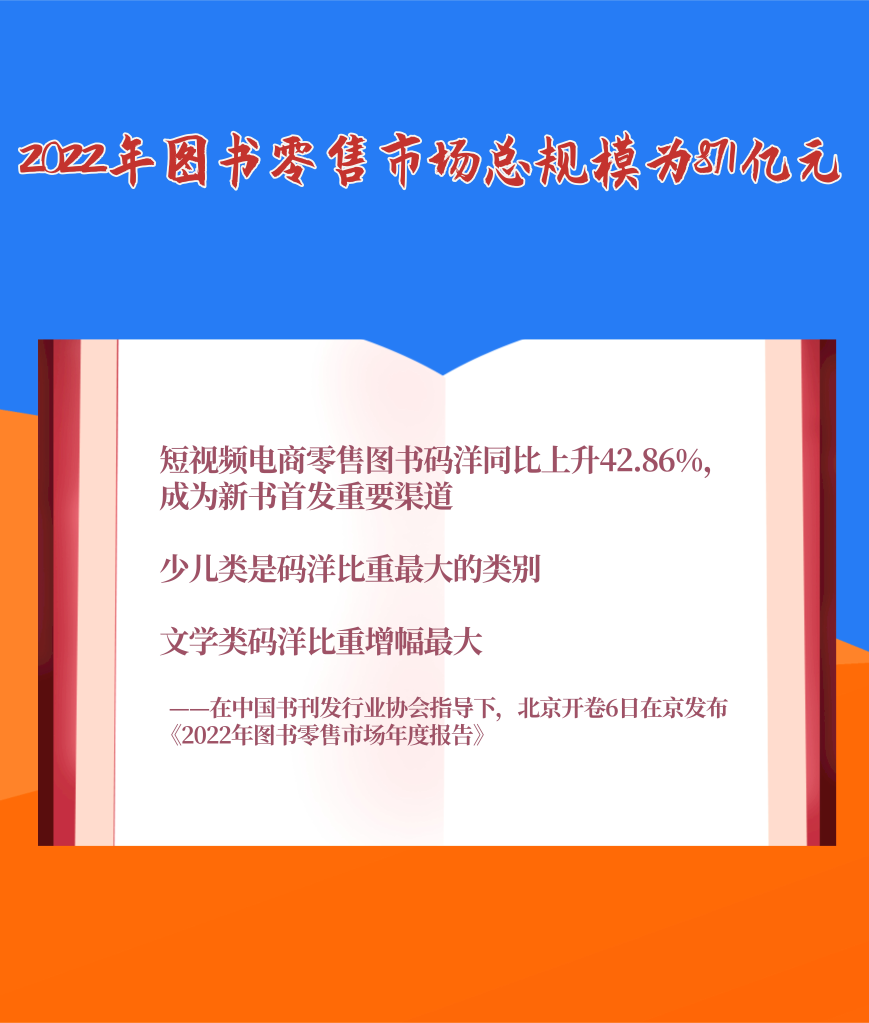 1月6日,在中國(guó)書刊發(fā)行業(yè)協(xié)會(huì)指導(dǎo)下,北京開卷信息技術(shù)有限公司在京發(fā)布《2022年圖書零售市場(chǎng)年度報(bào)告》。報(bào)告顯示,2022年我國(guó)圖書零售市場(chǎng)碼洋規(guī)模為871億元。短視頻電商零售圖書碼洋同比上升42.86%,碼洋占比趕超實(shí)體書店,成為新書首發(fā)重要渠道。