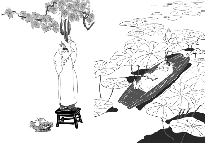 綠葉扶紅花,雅閣、秋雨為這本書的配圖也頗有特色。隨筆《理想與鄉(xiāng)愁》的封面,是一位戴著眼鏡、長(zhǎng)相酷似作者的文人站在小凳子上,準(zhǔn)備將掛在枝頭的絲瓜摘下來(lái)以供午餐之需,腳旁一只狗狗看守著筐子里的兩個(gè)大水蘿卜。這幅圖與左面的書名遙相呼應(yīng):作者的“理想”與“鄉(xiāng)愁”就在絲瓜藤下結(jié)為了一體。詩(shī)集《人生歸處是田園》的封面是三株樹下,那位戴眼鏡的文人坐在長(zhǎng)椅上,望著右面空椅子上的三只小鳥,一付若有所思的樣子;而葉廷芳為詩(shī)集所寫序言文末的尾花,還是這幅圖,只不過(guò)沿縱軸轉(zhuǎn)動(dòng)180°——文人從右面望向左面。一里一外兩幅畫互為鏡像,似乎是暗示人們,藝術(shù)就是社會(huì)生活既真實(shí)又不完全一樣的反映。