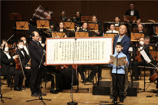 2月23日,北京,“前哲垂范 文津日新”——梁?jiǎn)⒊Q辰150周年紀(jì)念配樂朗誦音樂沙龍?jiān)趪?guó)家圖書館舉行。中國(guó)國(guó)家圖書館館長(zhǎng)熊遠(yuǎn)明(左)向梁?jiǎn)⒊笕速?zèng)手書《少年中國(guó)說(shuō)》。 蔣啟明/攝