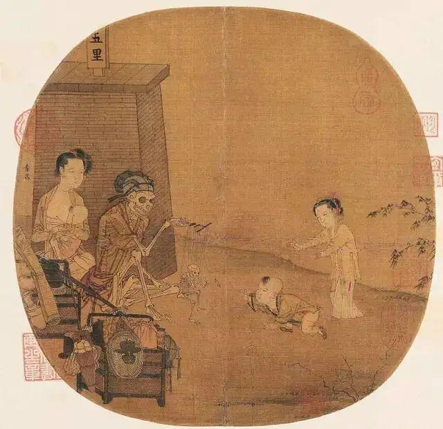 在這幅團(tuán)扇大小的畫面中,李嵩描繪了一幅傀儡戲的演出場景,一幅披衣戴帽的大骷髏,操縱著線板,指揮著一幅小骷髏在表演各種動作。一個嬰兒好奇地爬向那個表演中的骷髏小傀儡……活人與骷髏、生與死,同時出現(xiàn)于畫面中,在中國古畫里是極罕有的,也因此引起了后世的種種猜測解讀。