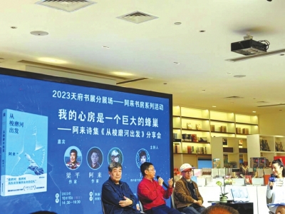 2023天府書展,各種名家分享會(huì)讓讀者應(yīng)接不暇。除了成都世紀(jì)城新會(huì)展中心主會(huì)場,分會(huì)場的活動(dòng)也精彩紛呈。10月15日下午,在西部文化產(chǎn)業(yè)中心阿來書房,阿來、葉舟、梁平三位名家開啟“我的心房是一個(gè)巨大的蜂巢——阿來詩集《從梭磨河出發(fā)》分享會(huì)”。三人上演老友記,分享會(huì)由阿來的青春期談起,氛圍詼諧幽默、愜意深情。