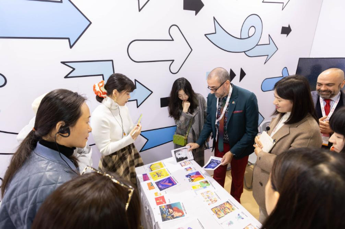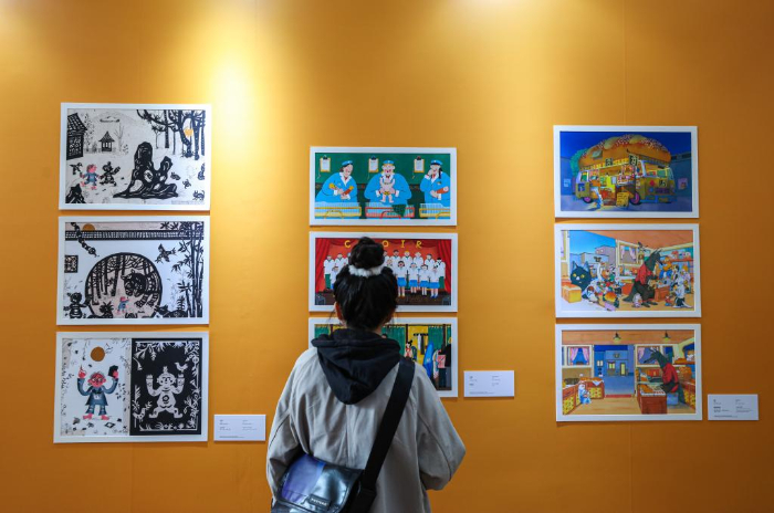 11月17日,參觀者在第十屆中國(guó)上海國(guó)際童書(shū)展現(xiàn)場(chǎng)觀看“2023金風(fēng)車國(guó)際青年插畫(huà)家大賽”參賽作品。