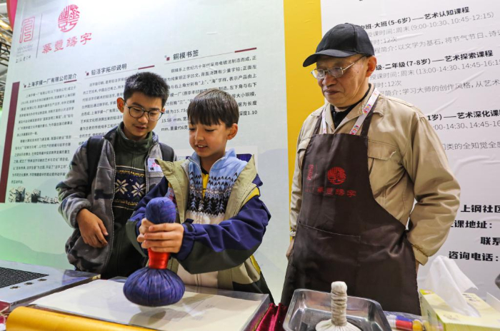 11月17日,參觀者在第十屆中國(guó)上海國(guó)際童書(shū)展現(xiàn)場(chǎng)體驗(yàn)活字印刷。