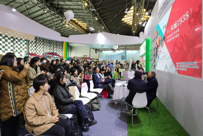 11月17日,藝術(shù)家蔡皋(右一)在第十屆中國(guó)上海國(guó)際童書(shū)展現(xiàn)場(chǎng)與書(shū)迷交流。