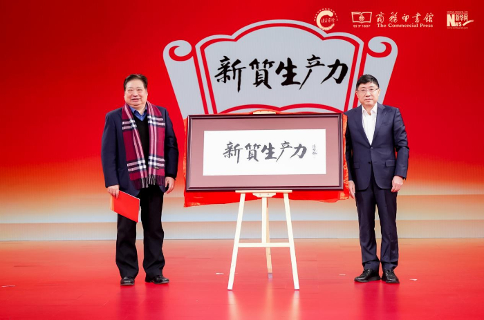 中國辭書學(xué)會會長、北京語言大學(xué)教授李宇明(左),中國出版集團(tuán)有限公司副總經(jīng)理、黨組成員陳永剛(右)揭曉年度國內(nèi)詞“新質(zhì)生產(chǎn)力”。新華網(wǎng) 發(fā)