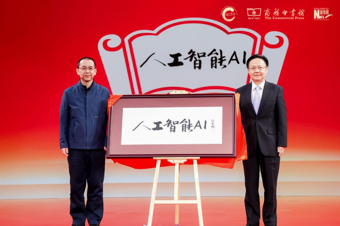 商務(wù)印書館副總經(jīng)理陳晗雨(左),中宣部“學(xué)習(xí)強(qiáng)國”學(xué)習(xí)平臺編委、副總經(jīng)理杜大力(右)揭曉年度國際詞“人工智能(AI)”。新華網(wǎng) 發(fā)