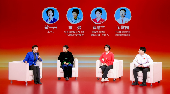 全國婦聯(lián)副主席(兼)、中央民族大學(xué)教授蒙曼,世界體操冠軍、“莫氏空翻”創(chuàng)始人莫慧蘭,中國體操運(yùn)動員、巴黎奧運(yùn)會冠軍鄒敬園接受訪談。新華網(wǎng) 發(fā)