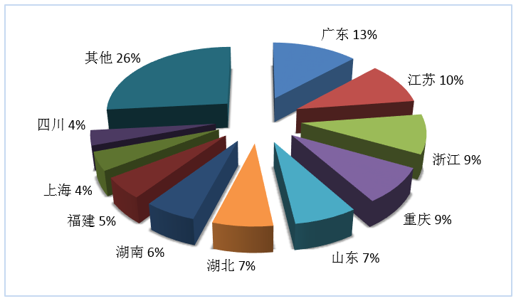 第三季度旅行社國內(nèi)旅游組織人次排名前十位的地區(qū)由高到低依次為廣東、江蘇、浙江、重慶、山東、湖北、湖南、福建、上海、四川(見圖3)。