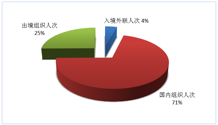 按照入境外聯(lián)人次、國內(nèi)組織人次、出境組織人次三項(xiàng)指標(biāo),入境旅游、國內(nèi)旅游、出境旅游市場人次所占份額依次為4%、71%和25%(見圖6)。