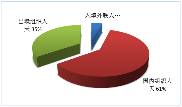 按照入境外聯(lián)人天、國內(nèi)組織人天、出境組織人天三項(xiàng)指標(biāo),入境旅游、國內(nèi)旅游、出境旅游市場人天所占份額依次為4%、61%、35%(見圖7)。
