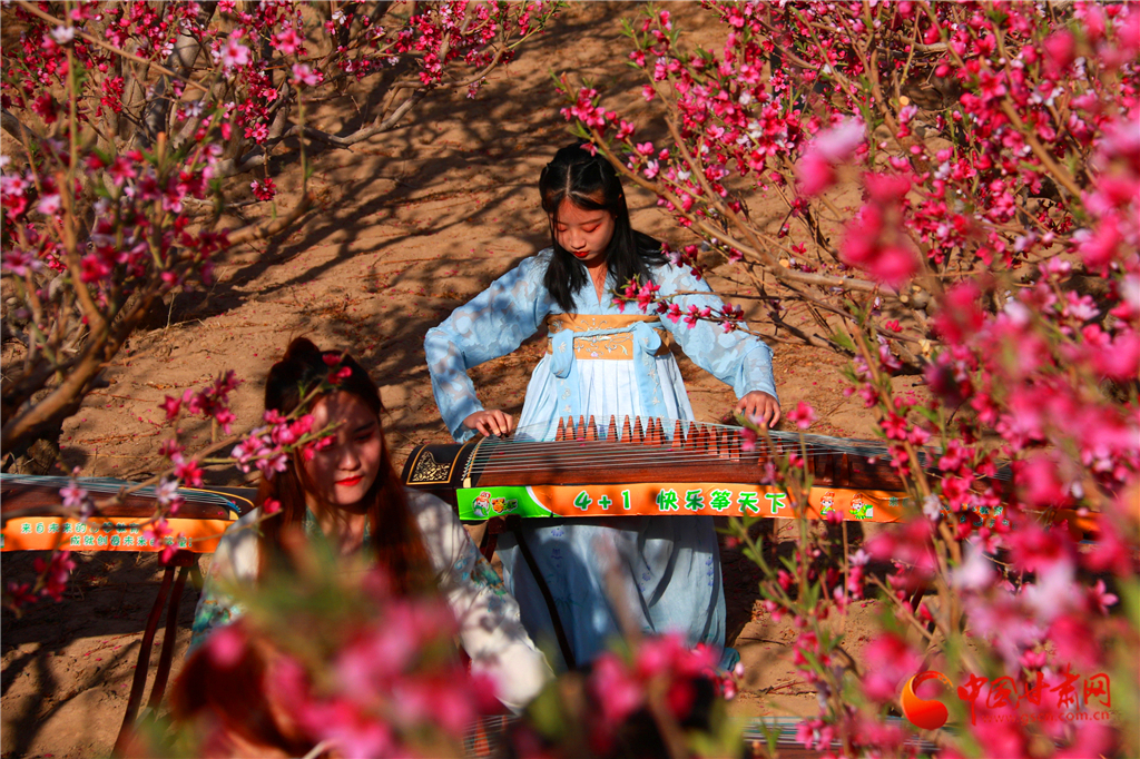 2020年4月22日,古箏愛好者在甘肅省敦煌市七里鎮(zhèn)杜家墩村的桃園中彈奏古箏。