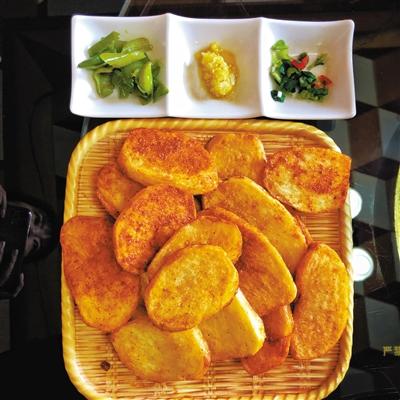 炕鍋洋芋是臨夏農(nóng)家樂(lè)里面常見(jiàn)的一道特色小吃,在臨夏,煎、烙之類的烹飪方式都被稱作炕,炕鍋洋芋因此得名。洋芋切片后,直接放熱油中兩面煎透??诲佈笥蟮淖龇m不復(fù)雜,但其對(duì)于火候的要求卻極其嚴(yán)苛,多一分會(huì)焦,少一分則不熟。