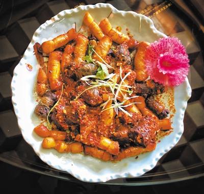 這道美食曾上過(guò)《舌尖上的中國(guó)》,它的神秘感來(lái)自于食材:發(fā)子色澤暗紅,面腸通體白凈,配以鮮紅的辣椒油,色澤亮麗,風(fēng)味獨(dú)特。發(fā)子是將新鮮羊心、羊肺、羊肉剁碎,拌以蔥、油、調(diào)味品,撒以適量面粉,制成餡子,裝入羊腸中,入火蒸好后,切段入盤。面腸以面粉為主料,配以調(diào)味品,灌入羊小腸中,放入蒸籠約蒸15分鐘,中間須針刺泄氣,以防破裂,熟后切段入盤。按臨夏習(xí)慣,發(fā)子面腸組合成一道菜,盤底放面腸,上面放發(fā)子,再放入辣椒油、蒜泥、香醋等即可享用。