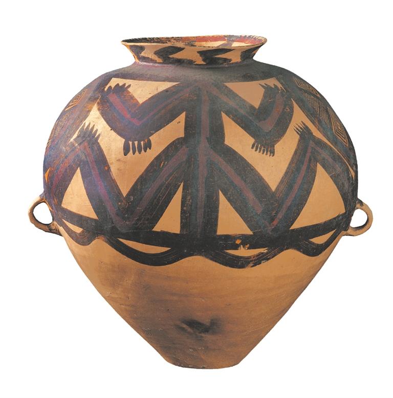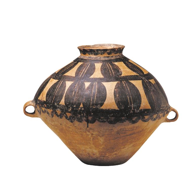 馬家窯文化半山類型(距今約 4500 年),廣河縣地巴坪出土。這是雙耳甕器型大氣貴重,施以紅、黑二彩,紅、黑彩交替使用,腹部繪多層連續(xù)垂弧紋和鋸齒紋,黑、紅彩交替使用,由三組分層連續(xù)的垂弧紋組成整體圖案,每層由兩層黑色帶紋和一層紅色帶紋組成,黑色帶紋上緣繪向上的鋸齒紋。整個圖案密集繁復,俯視猶如一朵盛開的鮮花,造型豐滿,色彩鮮艷。