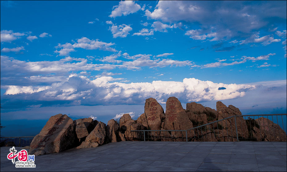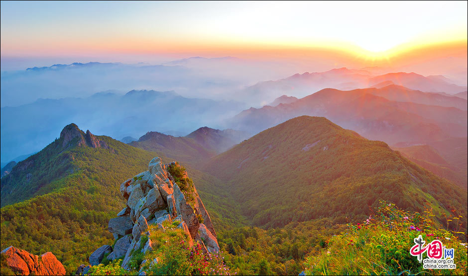 當北京的第一縷陽光從這里升起。站在海拔2118米的頂峰平臺上,遙望東方,天際中開始露出幾抹灰色的浮云,隨后不斷地升騰、擴大,繼而天邊漸紅,紅色越來越深,范圍越來越大,曙光漸露,丹霞輝映,把整個東方都變成濃濃的紅色。山峰在云霧中時隱時現(xiàn),彩云在天際間變幻,有時像奔馳的駿馬,有時像仙女飄逸,有時像玉樹瓊宮……千姿百態(tài),遐想無窮。猛然,比紅色的彩云更火紅、更光亮、更鮮艷的太陽露出了一條邊弧,緩緩上升。四周的云霧似乎忍受不了她那光茫的照射而淡化、隱退,太陽則很快掙脫了云霧與夜色的纏繞,迅速地上升,躍出天邊。霎時,一輪紅日噴薄而出,金光四射,霞光瑞氣,照徹天宇,山巒、萬樹沐浴著朝陽的金輝,令人眼花繚亂。舉目四望,朝霞映照下的霧靈山,群峰起伏,云霧如海,波濤洶涌,九曲十八彎的旅游公路似戲水游龍,在峰巒間若隱若現(xiàn)。