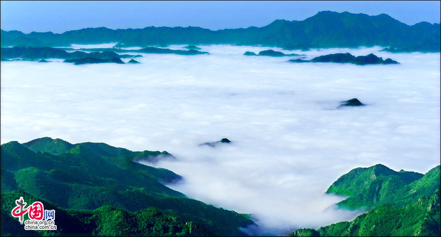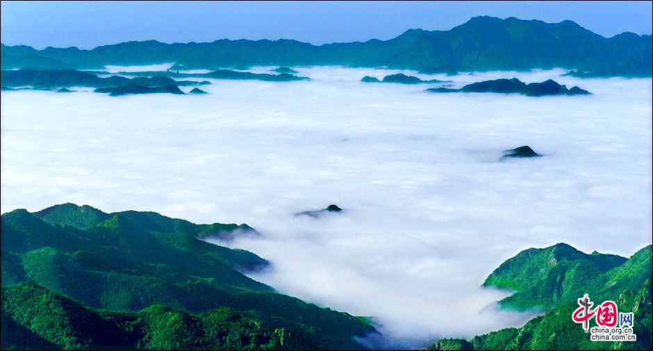 暖濕空氣上升到一定高度,遇冷凝結(jié)成云霧,形成霧靈山變幻莫測、波瀾壯闊的霧靈云海。云海在無風之際是出奇的平靜,輕風吹過,濺起層層浪花。風勢稍強,便似波濤洶涌,又如萬馬奔騰,置身山巔,神思飛越,浮想聯(lián)翩,仿佛進入夢幻世界。站在頂峰遠眺,山巒在云海中出沒無常,宛若大海中的無數(shù)島嶼,時隱時現(xiàn),似真似幻,使人感到一種神奇縹緲的仙境般的美。云海中的景物若隱若現(xiàn),虛虛實實,令觀者捉摸不定,于是產(chǎn)生幽邃、神秘、玄妙之感,給人一種朦朧的美。從美學角度觀察,霧靈云海妙在似海非海,非海似海。其潔白云霧的飄蕩,使霧靈山呈現(xiàn)出靜中寓動的美感。正是在這種動靜結(jié)合之中,造化出變幻莫測,氣象萬千的人間仙境。