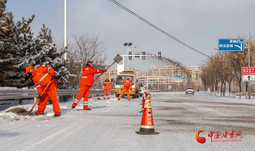 12月12日,甘肅省張掖公路局職工在國(guó)道227線撒鋪防滑料。
