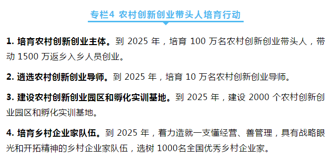 深入實施農村創(chuàng)新創(chuàng)業(yè)帶頭人培育行動,加大扶持,培育一批扎根鄉(xiāng)村、服務農業(yè)、帶動農民的創(chuàng)新創(chuàng)業(yè)群體。