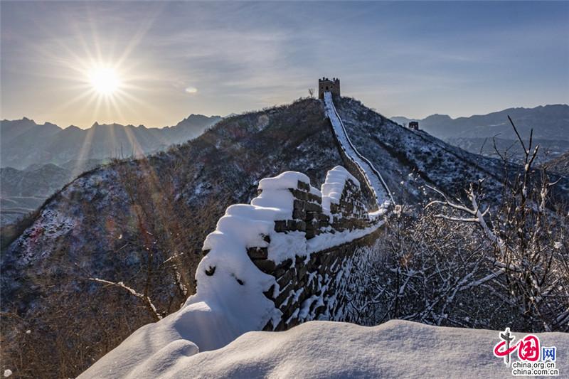 皚皚白雪覆蓋長城內(nèi)外,銀裝素裹金山嶺氣勢磅礴。