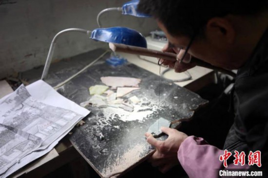 1971年出生的李成者從10多歲開始跟隨父親學習彩石鑲嵌技藝,在這一行已經(jīng)干了30多年。他說,彩石鑲嵌技藝在瑞安瀕臨失傳,目前在陶山鎮(zhèn)從事這一行業(yè)的不到10人。從這次制作彩石鑲嵌《清明上河圖》,他也學到了很多東西。