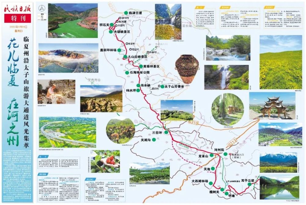 暢游沿太子山旅游大通道,不僅可以欣賞到“雙峽中分天際開(kāi),黃河擁雪排空來(lái)。奔流直下五千丈,怒濤終古轟春雷”的自然景觀,亦可欣賞到“八千游女唱牡丹”的人文景觀,可全方位領(lǐng)略臨夏的關(guān)隘歷史文化、花兒文化、民俗文化、民族風(fēng)情、非遺文化、飲食文化及紅色文化等。