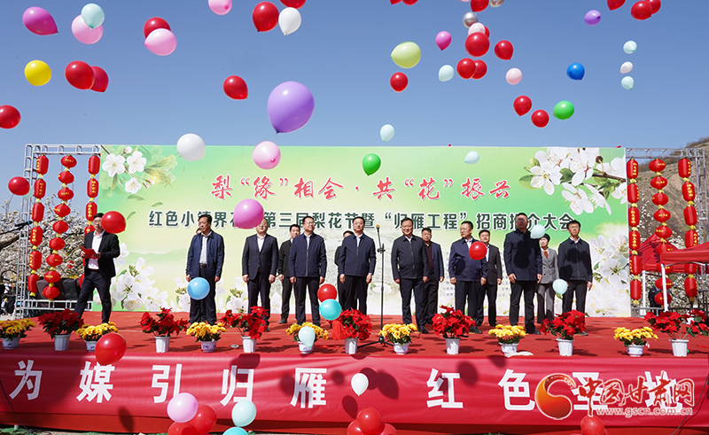 中國(guó)甘肅網(wǎng)4月21日訊(本網(wǎng)記者 李紅軍 通訊員 任建祥  馬麗麗)4月20日,平?jīng)鍪徐o寧縣界石鋪鎮(zhèn)李堡村彩旗飄飄、人頭攢動(dòng)。界石鋪鎮(zhèn)第三屆“梨‘緣’相會(huì)·共‘花’振興”梨花節(jié)暨“歸雁工程”招商推介會(huì)在這里舉行,各界人士集聚梨園賞花游春,共商鄉(xiāng)村振興發(fā)展之計(jì)。