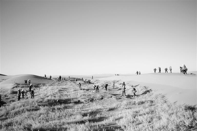 “父輩們治沙最早是從1969年春季開始的,當(dāng)時沙漠越逼越近,風(fēng)沙肆虐下不但收成銳減,祖祖輩輩賴以生存的土地和村莊也面臨著被吞沒的危險。”郭萬剛說,對農(nóng)民來說,失去土地就等于失去基本的生存保障。萬般無奈下,父輩們決定放手一搏,集中在沙漠周邊的300余畝土地上,種植梭梭、花棒等沙漠植物,抵御沙漠的進(jìn)逼。