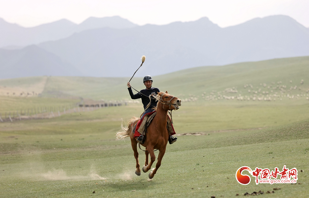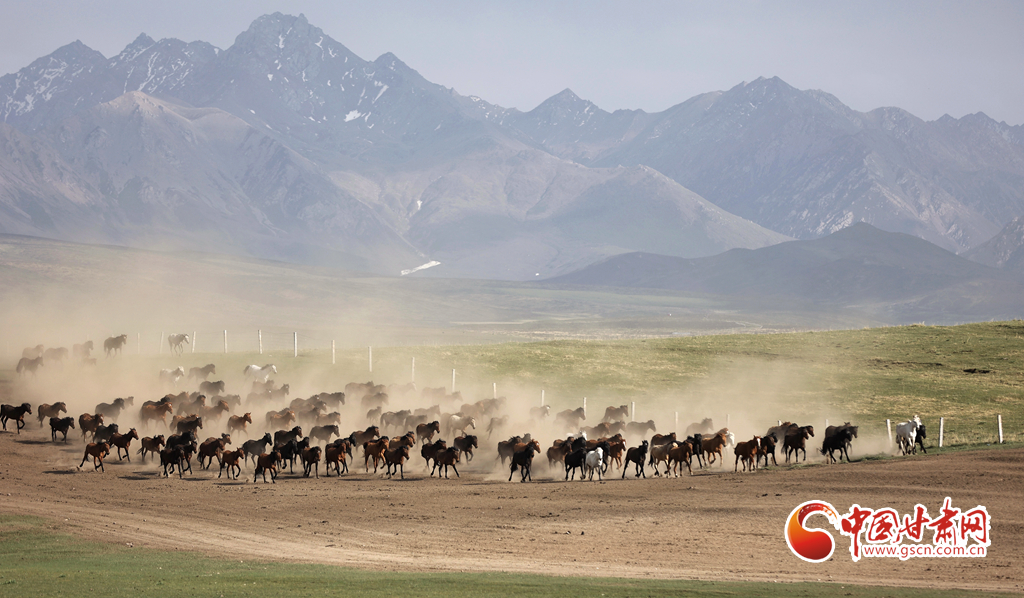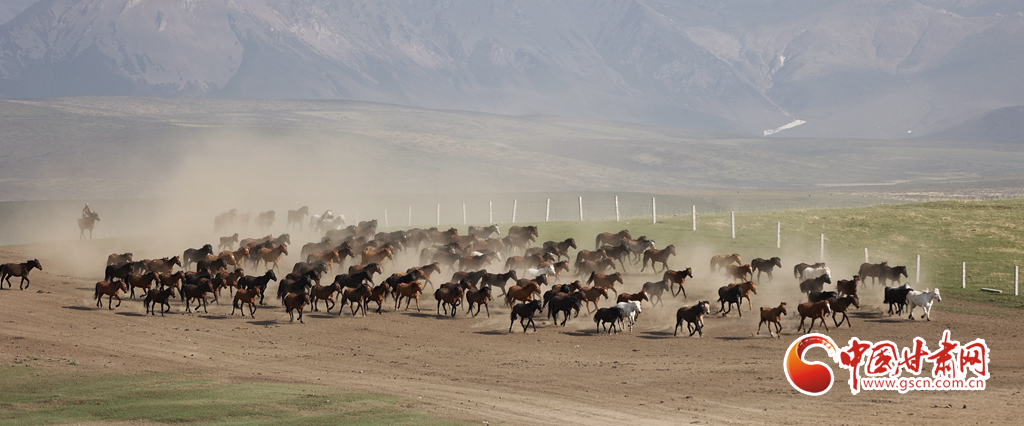 夏日,位于祁連山北麓的甘肅張掖山丹馬場綠草如茵,牧馬人揚(yáng)鞭催馬,山丹馬場再現(xiàn)萬馬奔騰景象。