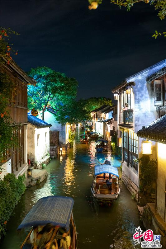宋朝時候,宵禁解除,每至深夜,燈火通明。如今周莊的夜色,亦是在光影中沉醉,水影搖曳間,畫船枕眠。這里,可以陽春白雪,不食煙火;也可以徹夜不歇,最懂人間。這場周莊的溫柔夢,將一直編織下去……澤國溫柔的清風,夜間可愛的彎月,若能與你共賞,那便再無遺憾。歌里唱,不懼怕,天涯路長,甘為你,披滿身風霜,請君,入夢。(尤紫璇 周宣)