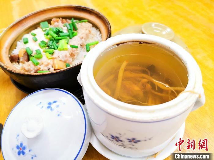 資料圖為特色煲仔飯搭配原盅參絲燉湯,是廣東臺山部分食客的選擇之一。 中新社發(fā) 李曉春 攝