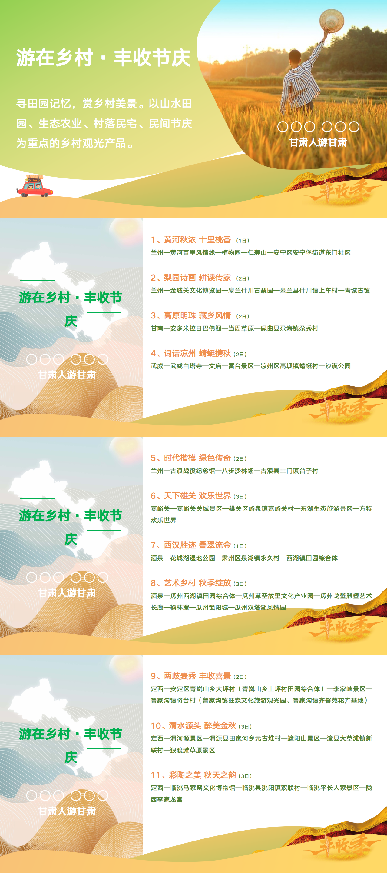 新華財經(jīng)北京8月26日電(曾喆、劉耀芳) 為進(jìn)一步推進(jìn)鄉(xiāng)村旅游高質(zhì)量發(fā)展,精準(zhǔn)有序促進(jìn)文旅消費穩(wěn)步恢復(fù),甘肅省文化和旅游廳以喜迎國慶、中秋“雙節(jié)”和“中國農(nóng)民豐收節(jié)”為契機(jī),整合隴原秋季鄉(xiāng)村旅游特色優(yōu)勢資源和產(chǎn)品,策劃推出5大類61條“甘肅人游甘肅”鄉(xiāng)村旅游樂享金秋精品線路。